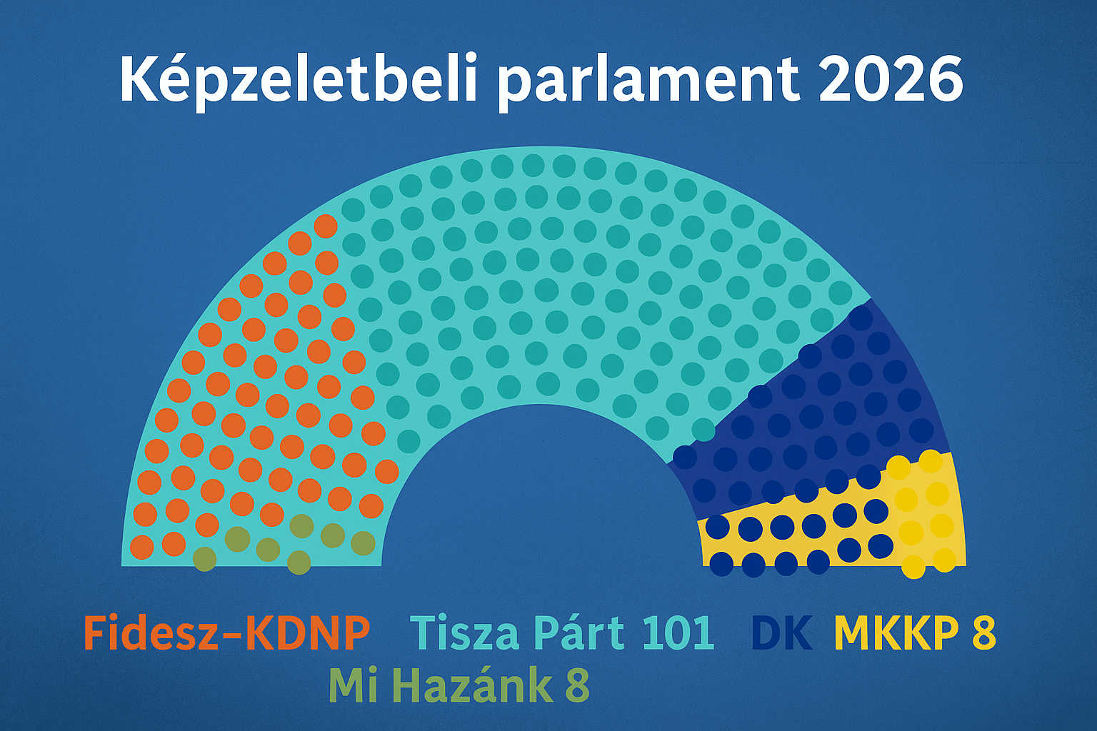 Ha Magyar Péter pártja megszerzi az első helyet, akár önálló többséget is elérhet a parlamentben. Egy ilyen eredmény körülbelül 100–105 mandátumot jelentene számukra a 199 fős Országgyűlésben. A Fidesz–KDNP körülbelül 75–80 mandátummal végezne a második helyen, a Mi Hazánk 7–9 hellyel, míg a DK és az MKKP 5–6 fős frakciót alakíthatna. - Fidesz–KDNP megtartja a vezetést: